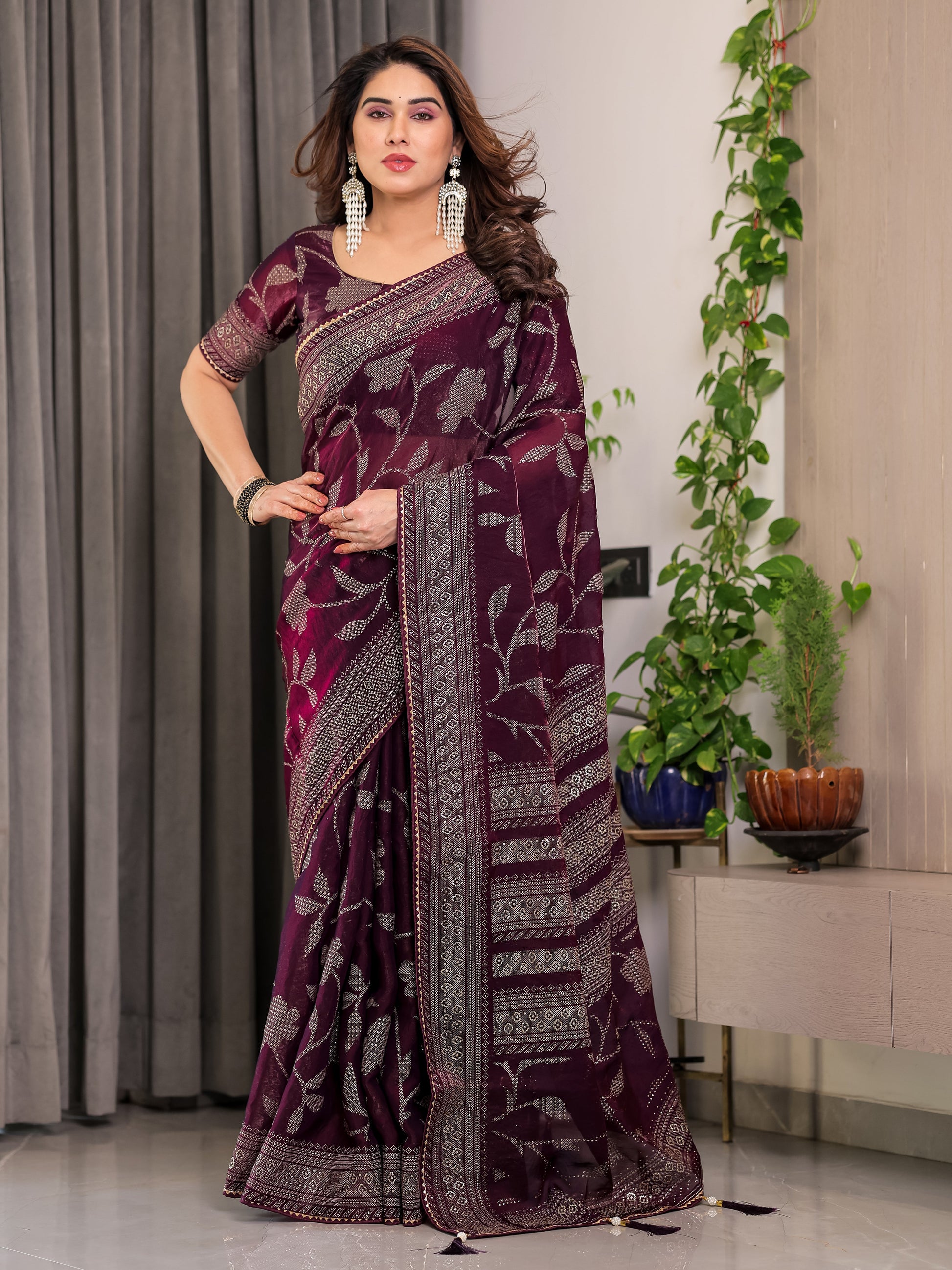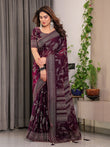 Wine Plum Fendi Satin Leafy Floral Block & Foil Printed Saree with Geometric Border, Tassel Edges & Attached Blouse