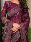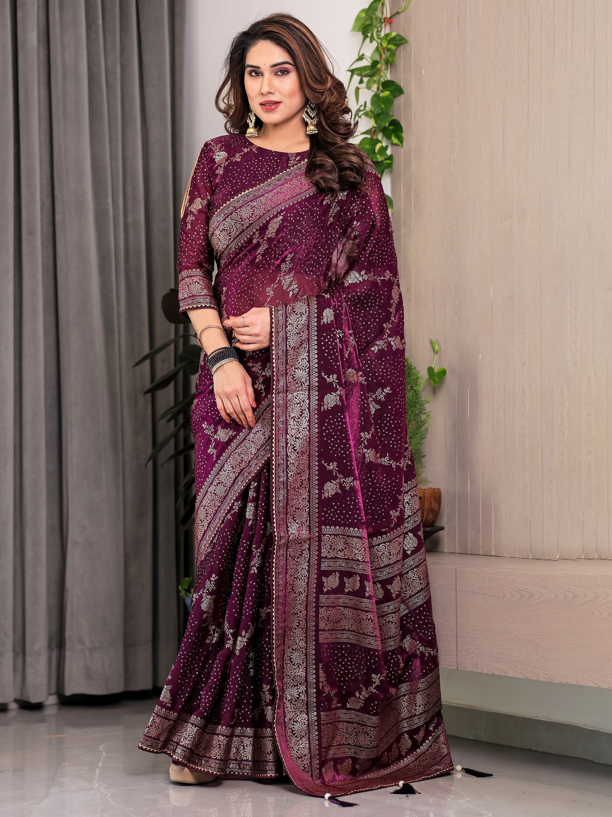 Wine Purple Fendi Satin Floral Block & Foil Printed Saree with Ornamental Border, Tassel Edges & Attached Blouse