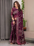 The rich wine purple base is adorned with all-over floral block-printed motifs, enhanced with subtle foil detailing that adds a graceful festive shimmer. The saree is further enriched with a broad ornamental border and intricately designed pallu, showcasing heritage floral and geometric patterns that lend depth, richness, and regal charm.